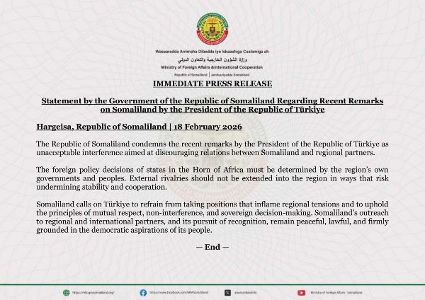 Read More Dec 31, 2025 The Ministry Of Foreign Affairs and international cooperation of the republic of somaliland IMMEDIATE RELEASE